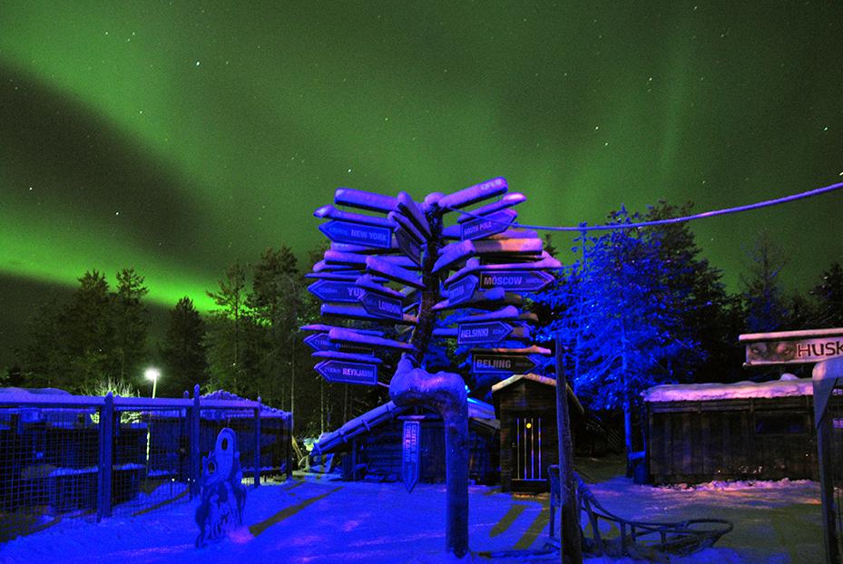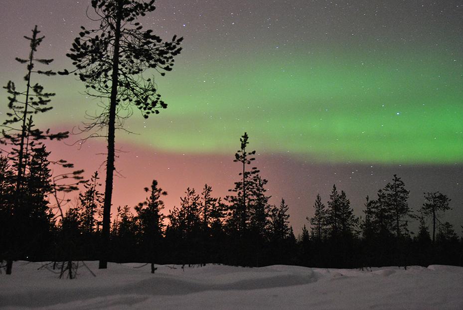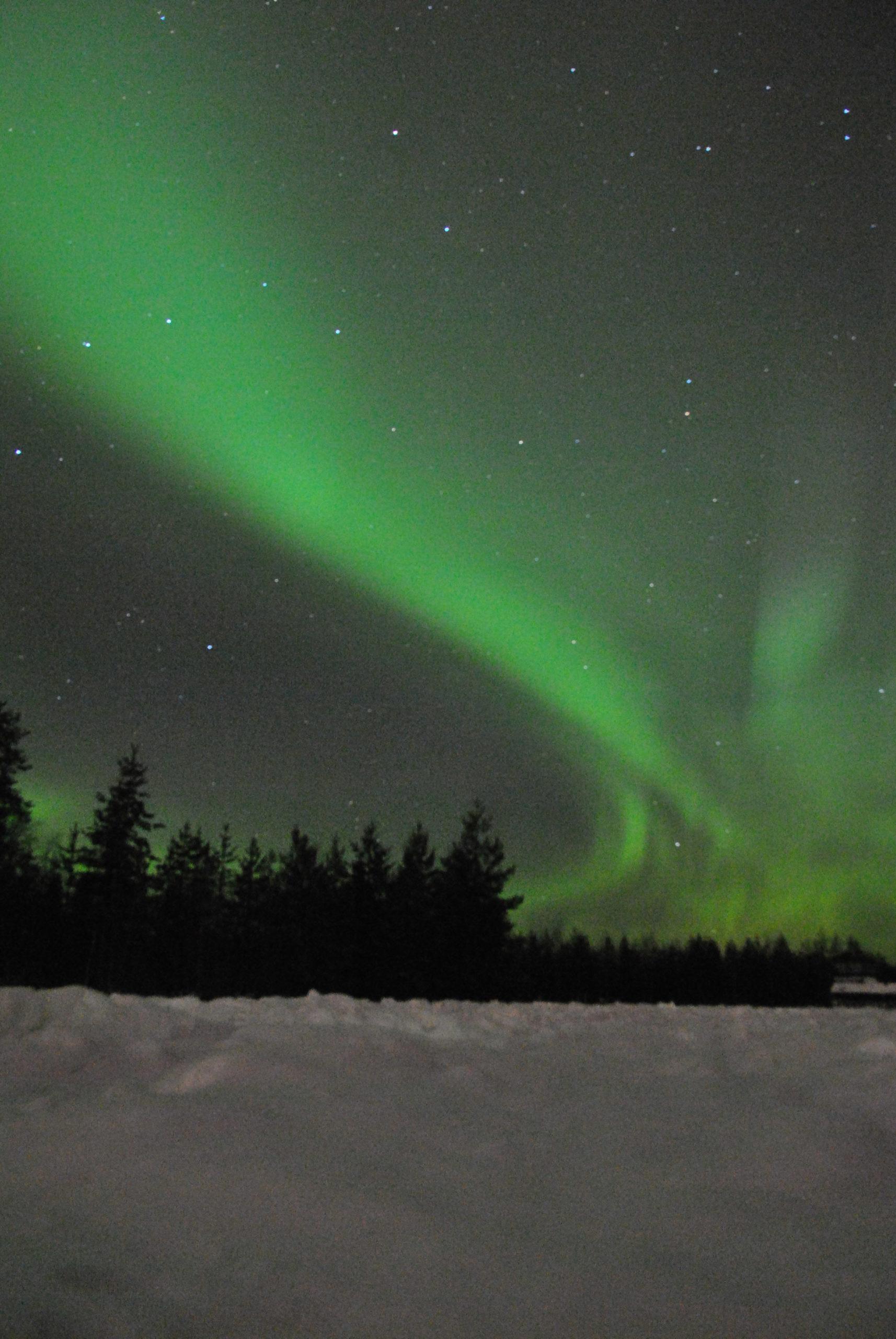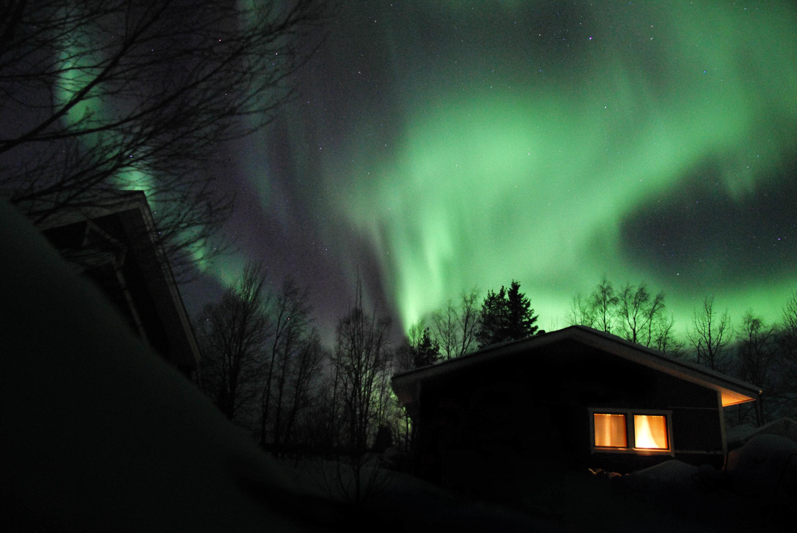 A moderate amount of artificial light can make a picture interesting. Here are two examples of northern light photos featuring objects. The first picture features a dead tree in front of the camera. The tree has not been artificially lit, and it is difficult to see the object clearly (exposure time 2,5 seconds, mouse over the pictures to see details). In the second picture below the yard was lit with blue lights. The exposure time was set to 20 seconds in order to get the aurora in the picture as well.